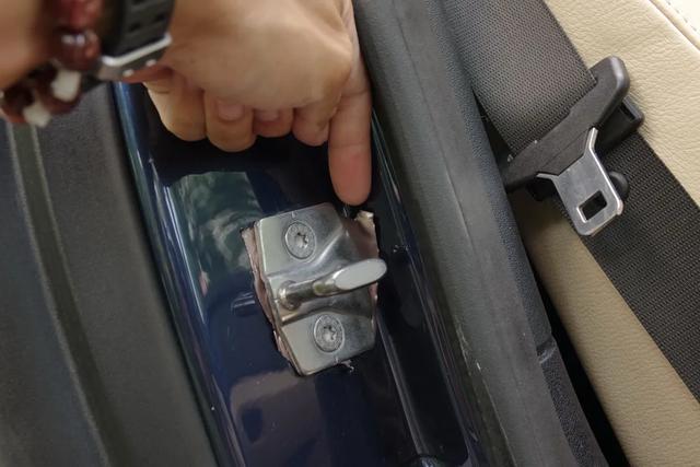 为了给大家表达清楚这个部位的尺寸,我找了张卡做一个对比。就是卡挡住的这一个部分被挤凹陷下去了一些,后来又被钣出来了,现在开关门也完全不觉得有障碍。