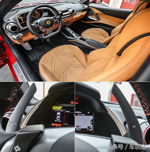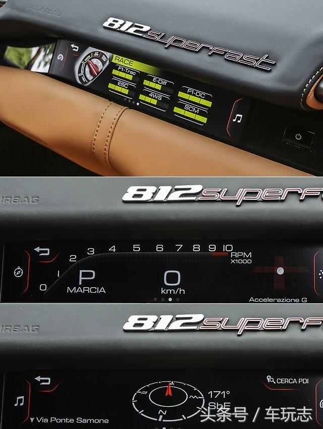 座舱设计方面,既然定位为超级GT跑车,812 Superfast当然就不能像斯巴达设定的F12tdf一样、只留下「驾驶」必要的操作设备,因此812 Superfast不仅可选搭能将你紧紧拥抱著的手动可调式赛车座椅,也可换装电动可调的跑车座椅;驾驶人的前方,则为附换档拨片的真皮三辐式多功能方向盘,可用右手轻拨操作升档、左手控制降档 (左/右手2片同时拨则可进入N空档),方向盘右下角的Manettino车辆动态模式切换钮的造型则沿用了GTC4Lusso上的设计,并提供WET (湿地)、SPORT (跑车)、RACE (赛车)、CT off (循迹关闭) 和CST off(动态稳定电子系统全关)5种模式,且皮革与饰板拥有多种搭配选择。