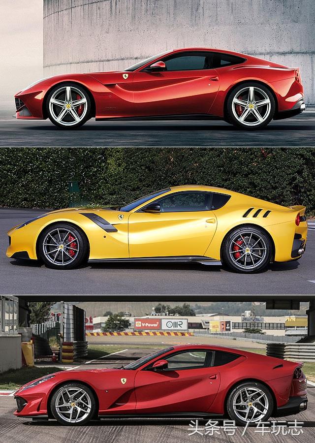 车侧方面,长车头与水滴形车顶的曲线,乍看之下虽然与F12berlinetta仍极为相似,但其实812 Superfast前叶子钣、车门、C柱和后叶子板上方的气流孔道,均已和F12berlinetta与F12tdf完全不同,并重新设计了车外后视镜与侧裙的造型,并于车尾换上较F12berlinetta加高30mm的一体式尾翼。