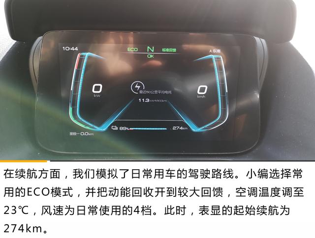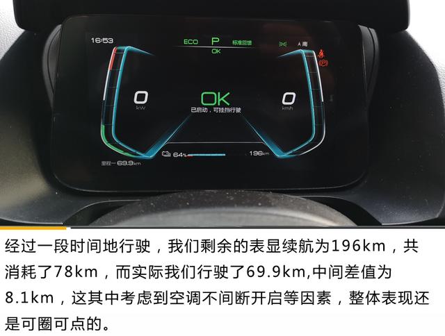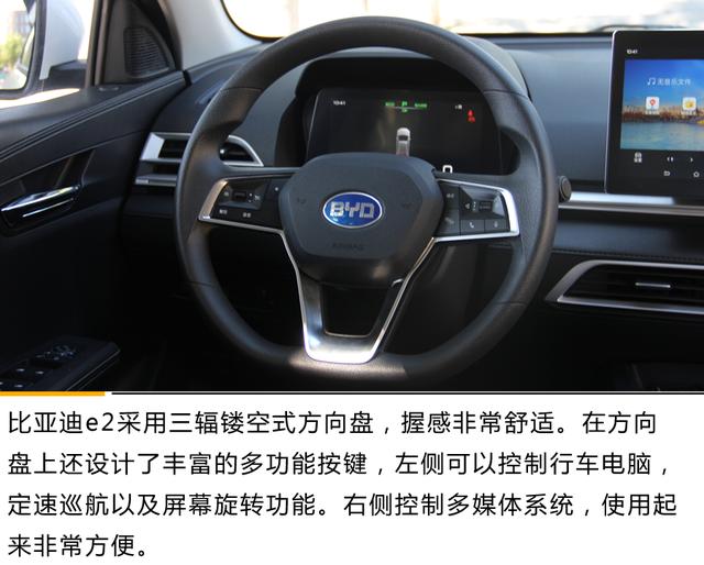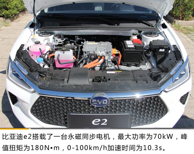 比亚迪e2搭载了永磁同步驱动电机,最大功率70kW,峰值扭矩180N·m。而电池方面,新车提供了35kWh以及47kWh两种可选,NEDC综合续航里程分别为305km和405km,并提供直流快充和交流慢充两种接口,直流快充30min可由30%充至80%。新车0-50km/h加速时间3.9s,0-100km/h加速成绩为10.3s。小编今天试驾的车型为续航305km的版本。
