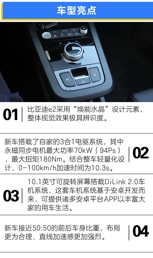 编辑总结:作为一款比亚迪主打的新车型,比亚迪e2在成熟的平台基础上,拥有足够的续航基础,并可以提供一定的运动属性。在价格方面,新车补贴后售价区间为8.98-11.98万元,优势还是比较明显的。针对跨界纯电动车的空白,e2完全可以成为消费者的新选择。