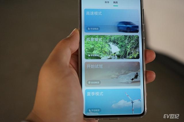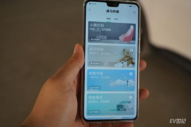 在威马智行APP中,官方预置了“小憩片刻”、“亲子空间”、“智能节能”、“性能模式”、“高速省心”五大场景模式。