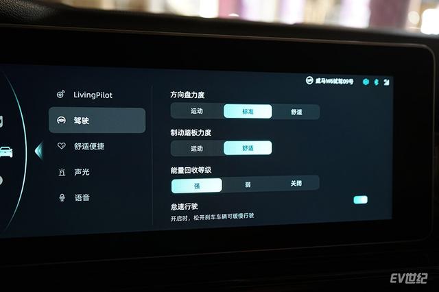 在转向方面,威马W6也提供了舒适、标准和运动三种模式。在标准和运动模式下,方向盘的转向力度会发沉,个人感觉不如舒适模式操控起来随意,估计大部分用户在日常使用时都会选择舒适模式。