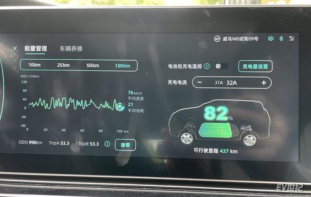 在到达目的地时小计里程显示行驶了53.3km,表显剩余续航里程为437km,表显续航消耗了73km。在整个路线中,由于90%的路程都是行驶在上海绕城高速上,平均车速在90km/h以上,并且驾驶员和乘客都是体重在100kg以上的偏胖人士,全程还开着空调,所以威马W6的续航表现还是可以接受的。