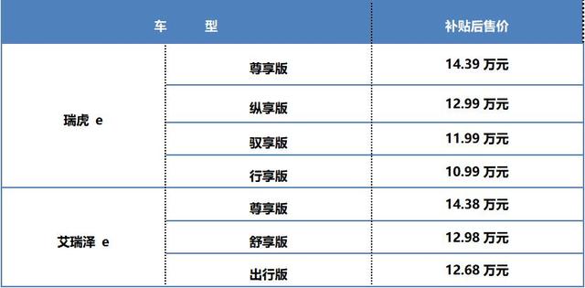 8月25日,备受瞩目的奇瑞新能源最新车型——纯电SUV瑞虎 e与A级纯电轿车艾瑞泽 e双车正式上市。本次上市,瑞虎 e新车共提供行享版、驭享版、纵享版、尊享版四款版型,补贴后售价10.99万起。艾瑞泽 e共提供出行版、舒享版和尊享版车型可选,补贴后售价为12.68万起。续航方面,两车的NEDC综合续航均为401km,60km/h等速最大续航则双双达到500km,在同级车型中均处领先地位。