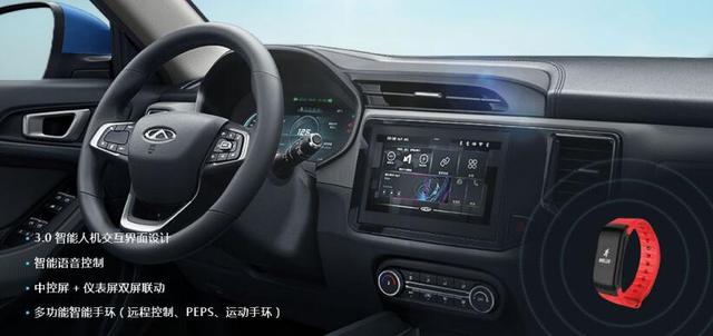 内饰方面,瑞虎 e采用了直线与棱角勾勒的极简造型,三幅式多功能真皮方向盘,以及中控台自然触感的软包覆材质搭配镶嵌的金属镀铬条装饰,令座舱尽显豪华大气。瑞虎 e车内搭载7英寸多功能液晶仪表盘和9英寸中控触摸屏,并增设电子手刹以及同级独有的升降式旋钮换挡等配备,换挡旋钮可随着车辆的启动和断电自动升降,大大增强了驾驶时的仪式感和科技感,此外,瑞虎 e还贴心设计了主驾6向电动科技座椅,并包含电动腰托、前排座椅加热功能,实现了同级最优,也为用户带来了更舒适的驾乘感受。