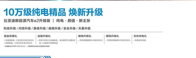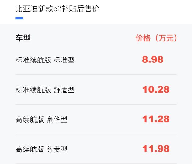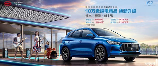 易车讯8月25日,比亚迪新款e2正式上市,此次共推出4款车型,补贴后售价区间8.98-11.98万元。新车依旧保持旧款车型的造型设计,但在配置方面有所提升。续航方面,新车依旧推出了两种续航版本的车型,分别为305km和405km。