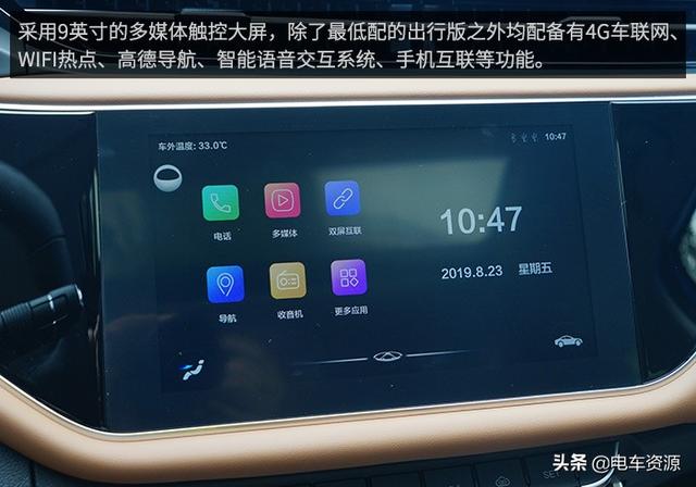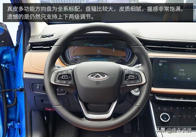 真皮多功能方向盘为全系标配,盘辐比较大,皮质细腻,握感非常饱满,遗憾的是仍然只支持上下两级调节,不过艾瑞泽e的方向盘原本设计的就距离驾驶台比较远,至少对于笔者来说,想要找到合适的角度并不难。