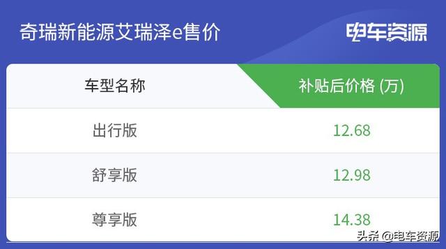 奇瑞新能源艾瑞泽e一共推出了三款车型,补贴后的售价区间为12.68-14.38万元。