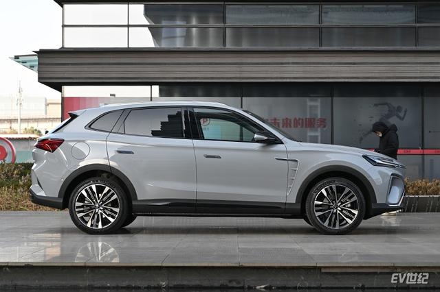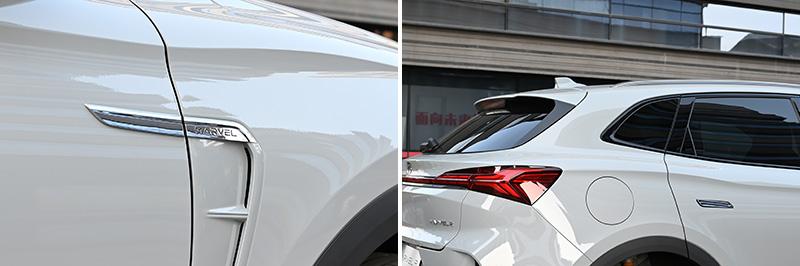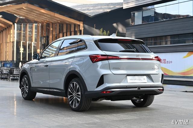 MARVEL R侧面造型流畅动感,车头相对较长,车身低矮,同时使用了大宽体设计,轿跑风格非常浓郁。前翼子板后部配有硕大的导风槽,腰线凌厉,车顶由前向后逐渐下压,配合较大尺寸的运动造型轮毂,有着很强烈的高级感和运动感。
