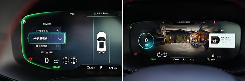 12.3英寸的全液晶仪表具有“MR增强模式”、“AR实景模式”和“3D地图模式”三种设定。MR增强模式 可以理解为类似特斯拉的可视化行车信息界面,可以将大量周边交通参与者显示到仪表内。AR实景功能是上汽比较独特的亮点,值得一提的是,在实际行驶过程中,车辆可以根据路况变化智能的进行显示模式切换,方便驾驶员做出判断。