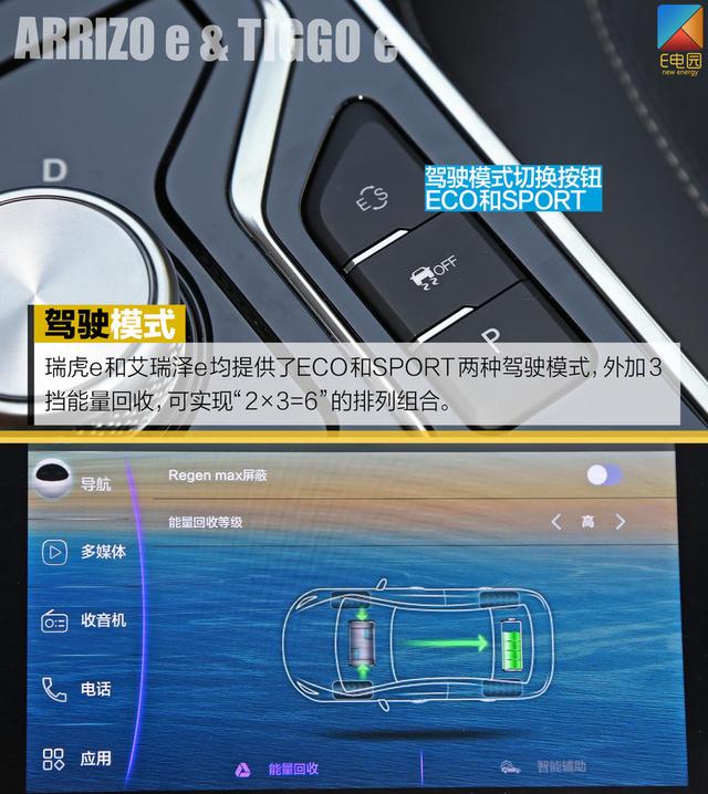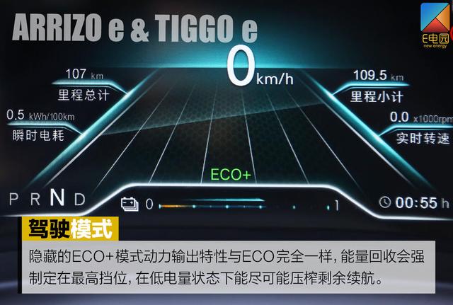 首先,不是量产状态的能量回收以及驾驶模式方面。瑞虎e和艾瑞泽e均提供了ECO和SPORT两种驾驶模式,外加3挡能量回收,可实现“2×3=6”的排列组合。另外,隐藏的ECO+模式动力输出特性与ECO完全一样,能量回收会强制定在最高挡位,用于低电量无法尽快充电、仍需行驶的状态,以备不时之需。