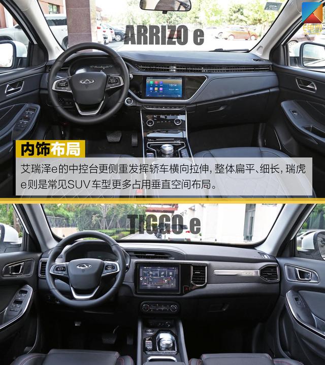 内饰方面,艾瑞泽e的中控台更侧重发挥轿车横向拉伸,整体扁平、细长,瑞虎e则是常见SUV车型更多占用垂直空间布局,仪表盘展现行驶乃至更多模块的位置之间的差异,也都是燃油版车型的延续。