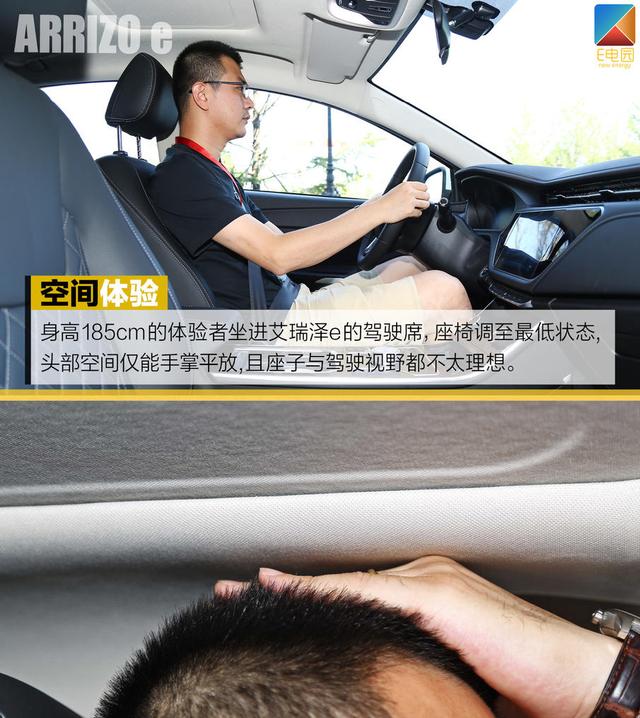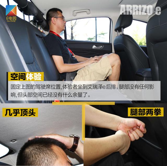 如果说新老平台在底盘上的差异没那么典型,毕竟最主要的“锅”是后悬挂形式,那么头部空间一下就看出来了。艾瑞泽系列燃油版车型头部空间就局促,来到“油改电”的艾瑞泽e之后,这个问题又被放大了一些,这正是早期 “油改电”车型的通病,底盘布置电池组会挤压到乘客的头部空间。如图所示,艾瑞泽e很难兼容身高180cm以上的乘客。