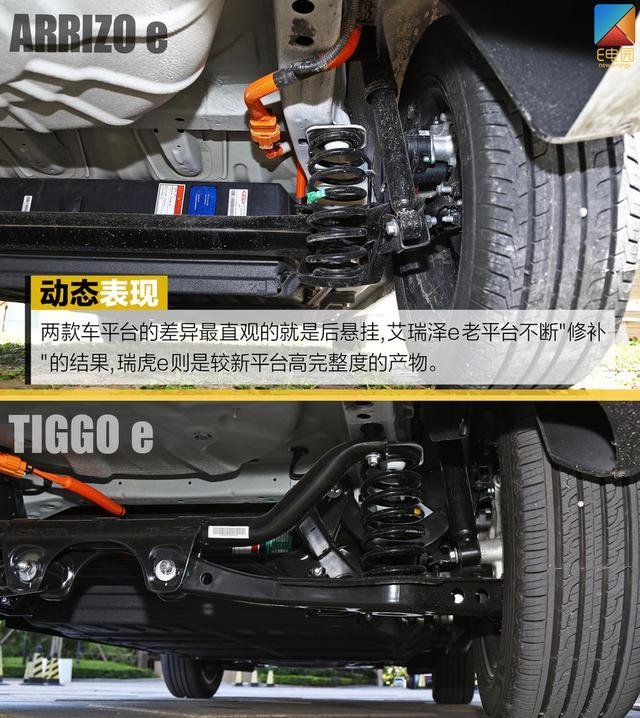表面上,艾瑞泽e和瑞虎e最大差别是后悬挂,前者是非独立,后者采用了独立后悬挂;归根结底,这就是整车平台埋下的伏笔:艾瑞泽e是较老燃油车平台一直优化的结果,瑞虎e则是较新平台、奇瑞SUV产品主要载体T1X平台的产物。