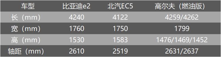 虽然不是王朝系列的产品,但是比亚迪e2还是采用了大量"Dragon Face"的设计元素。巨大的六边形前格栅内部配以满天星饰条进行装点,十分动感。整车采用了多处折线设计来突出力量感。车身侧面,新车红色制动卡钳、运动尾翼以及灵动的腰线都增加了整车的运动感。整车的风阻系数仅为Cd0.29,堪比轿跑。车尾部分,贯穿式的尾灯极具辨识度,立体感也强。"build your dreams"的镀铬饰条直接将车尾的档次提升了一个台阶。新车尺寸方面,其长宽高分别为4240/1760/1530mm,轴距为2610mm。比北汽EC5大上一圈,与燃油版的高尔夫相比,高度上占有优势,长、款以及轴距略小。