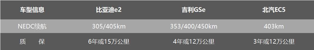 比亚迪e2搭载的是永磁同步驱动电机,最大功率70kW,峰值扭矩180N·m,匹配单速变速箱。新车0-50km/h加速时间3.9秒,0-100km/h加速成绩为10.3秒,新车百公里电耗为10.9kw·h。新车提供35kW·h以及47kW·h两种电池组可供消费者选择,对应的NEDC综合续航里程分别为305km和405km。相比于帝豪GSe以及北汽新能源EC5,在续航上的表现不分伯仲。但比亚迪提供了6年或15万公里的超长质保,相比于同级中3/4年12万公里质保要厚道很多。