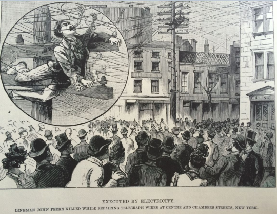 他的反交流电运动也许是出于对安全的真正担忧,也许不是。他给他的电灯公司总裁写了一封信,警告他们交流电的危险,他说:“和死亡一样肯定,西屋电气会在他安装任何型号的系统后的6个月内杀死客户。”果然,19世纪80年代末,纽约和其它几个城市发生了几起交流电高压造成的意外死亡事件。在一次事故中,电报员约翰·菲克斯(John Feeks)的尸体在惊恐的人群面前被缠绕在电线上,而他的死促使纽约立法将交流电线路移至地下。