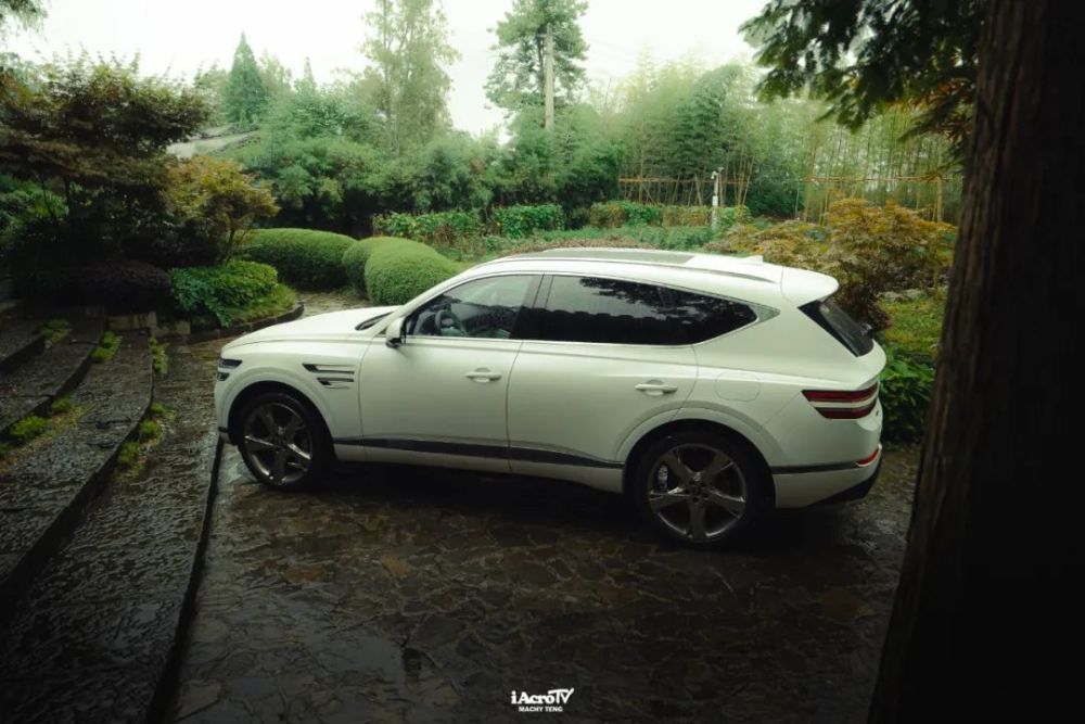 在幽静的道明竹艺村,这曼妙环境更加衬托GV80的设计美学。“勇者之徽”阔型格栅熠熠生辉,由LED头灯开始,沿着转向灯、车身轮廓直至尾灯,完美演绎捷尼赛思家族式“并行双耀”双线设计。