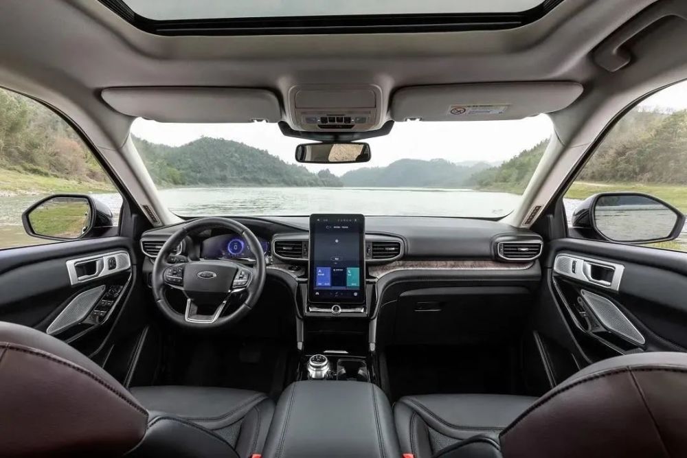 探险者的车内延续了美式SUV的传统风格,车内大面积真皮加缝线和实木饰板营造出了独特的美式豪华氛围,再加上宽大柔软的座椅,仿佛置身于美式乡村别墅一样。虽然整体是传统的美式风格,但是在科技范儿上,探险者也并不落后,12.3英寸全液晶仪表和搭载SYNC+ 2.0系统的纵置12.8英寸中控屏则带来了出色的智能化水平。