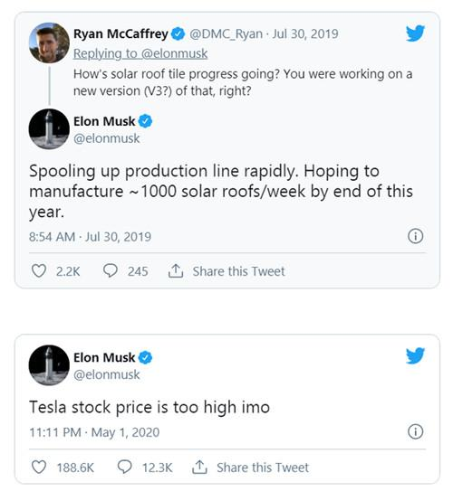 其一是2019年一条推文中,马斯克未经允许透漏公司的太阳能屋顶产值;其二是2020年抱怨特斯拉股价太高,这条推文随后造成公司股价下跌,市值损失逾130亿美元。