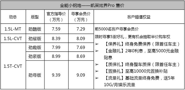 7月20日晚,“全能小钢炮”炫界Pro 燃擎上市。新车推出1.5T+CVT、1.5L+CVT,以及1.5L+MT三种动力总成,共计5款车型,提供冰晶白、炫动红、深海蓝、风清蓝、冷砂灰5款纯色车身及4款双色车身可选,尊享会员价7.29万元——9.09万元。