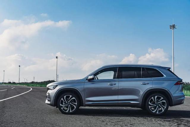 车身侧面,新车看上去充满了力量感,而微微凸起的前后侧翼子板、黑色宽厚轮眉以及大尺寸轮圈,让车辆很显气势。车身尺寸方面,新车的长宽高分别为4770mm\1895mm\1689mm,轴距则达到2845mm,从数据上看已属中型SUV标准了。
