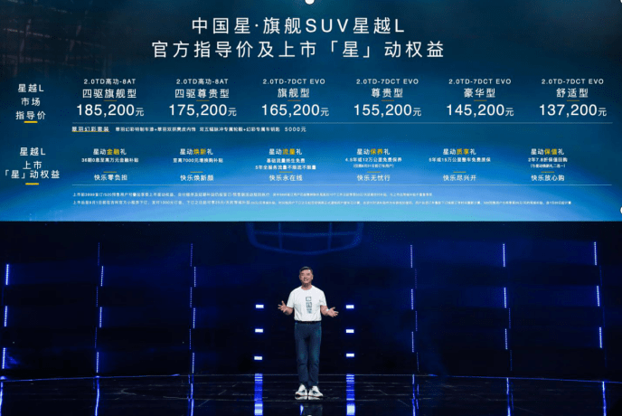7月20日,中国星旗舰SUV——星越L在杭州奥体中心亚运场馆全球上市。新车推出2.0TD-7DCT EVO、2.0TD高功-8AT两种动力组合共6款车型,市场指导价为13.72-18.52万元。