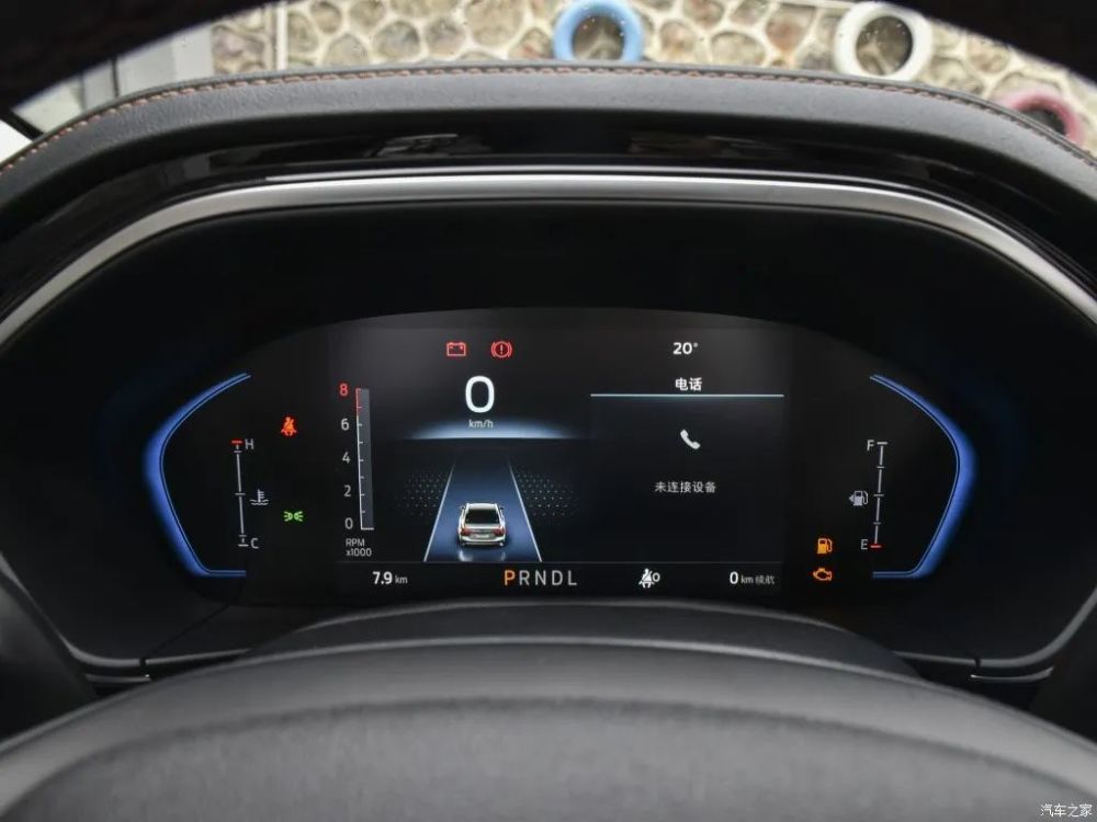 方向盘为三辐样式设计,最低配车型同样带有多功能按键,只是最低配车型并没有使用皮质材质包裹,手感方面会相对差一些。8英寸液晶仪表盘显示效果清晰,且支持3种界面样式可选。功能方面,可以显示油耗、续航里程、胎压等信息,足够满足日常使用。