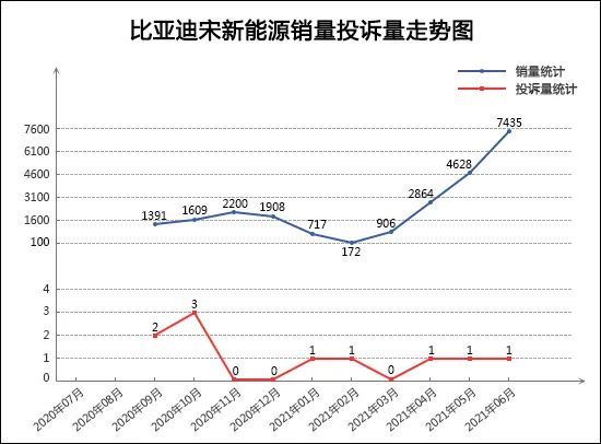 随着宋PLUS EV车型的上市,比亚迪宋新能源的月销量终于在“四连涨”后迎来了高光时刻。6月份,宋新能源的销量首次突破7000辆,环比上涨60.7%,创造了近一年来的月销量最高纪录。从其近一年里的销量投诉走势可以看出,宋新能源的销量呈现出阶梯式增长,上升势头强劲。反观其月投诉量表现,近一年来均处于个位数水平,投诉销量比表现好于同级别车型,短期的质量口碑值得肯定。整体来看,在宋PLUS EV/DM-i车型联手发力下,宋新能源的销量已步入上升通道,未来有望再创新高。