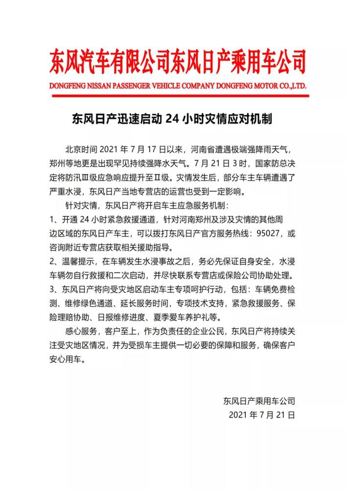 针对灾情,东风日产将开启车主应急服务机制: