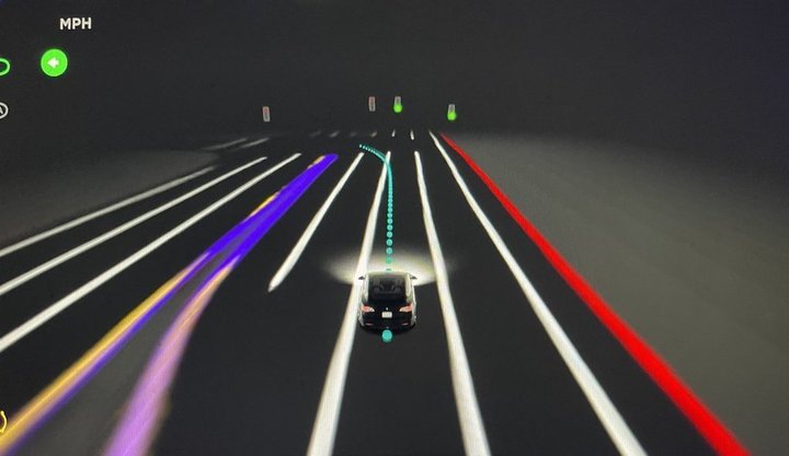 另一方面,特斯拉的「Mind of Car」驾驶可视化视图也有了较大的提升,不仅可以显示清晰的车道线,周遭的物体检测看起来也十分准确。