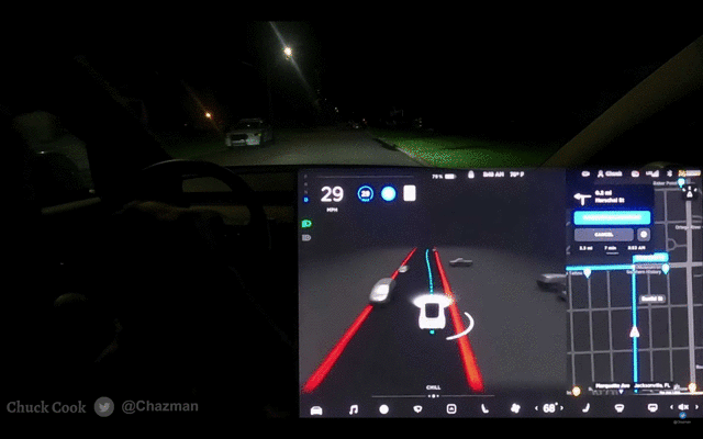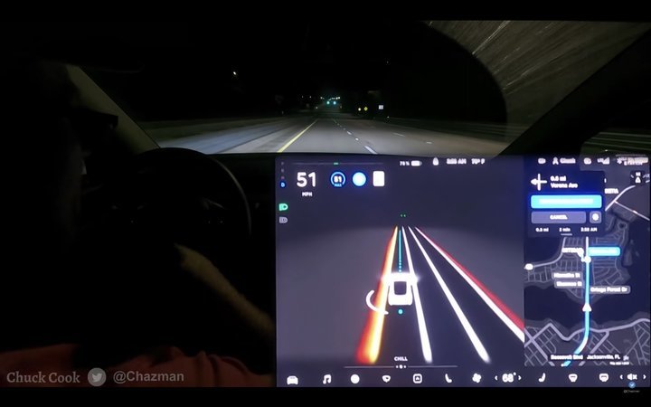 在@Chuck Cook 发布的视频中,他的特斯拉可以在车道清晰的城市道路中行驶。红灯停、绿灯行、识别限速标识已经是基本操作。