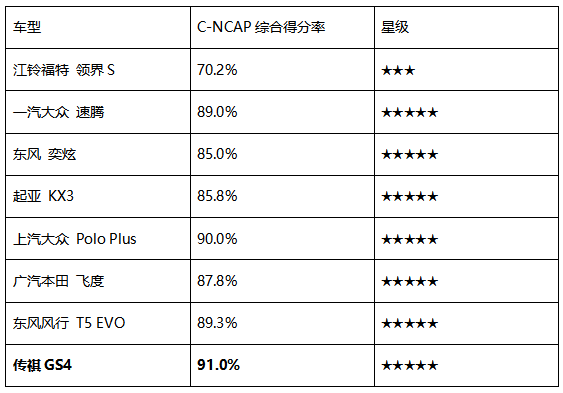 在2021年C-NCAP碰撞的“成绩单”中,传祺GS4凭借91.0%的超高综合得分率,不仅加冕五星评级,更成为 10万级车型中安全性No·1的存在,甚至赶超不少同价位合资车型,证明了自身五星成绩的 “含金量”更高。