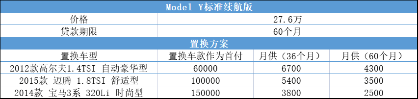 假设用户置换一辆2014款宝马3系320Li时尚型,旧车价值为15万元,那么这15万元可以直接作为首付,相当于“半价”购买Model Y,3年的月供也直接“打对折”。若选择60个月的方案,月供甚至低至2500元。