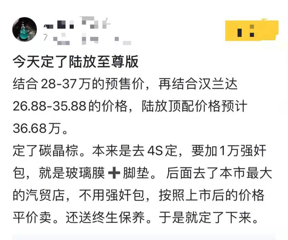 很多网友也开始期待“两强相争,渔翁得利”的好戏,毕竟此前汉兰达一家独大,加价卖车让很多钟情于它的消费者耿耿于怀,如今网上已经有车主晒出订单,表示目前在销售终端下单订购皇冠陆放,不用加价。