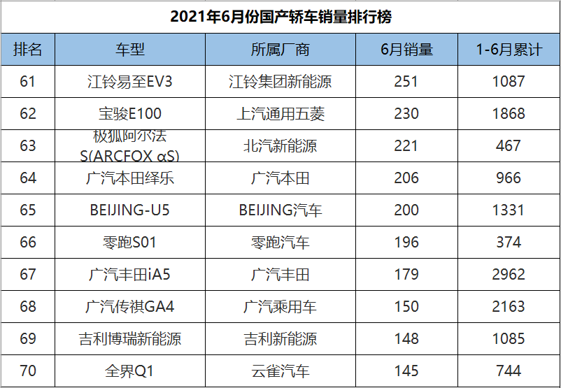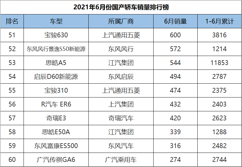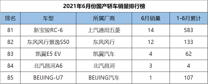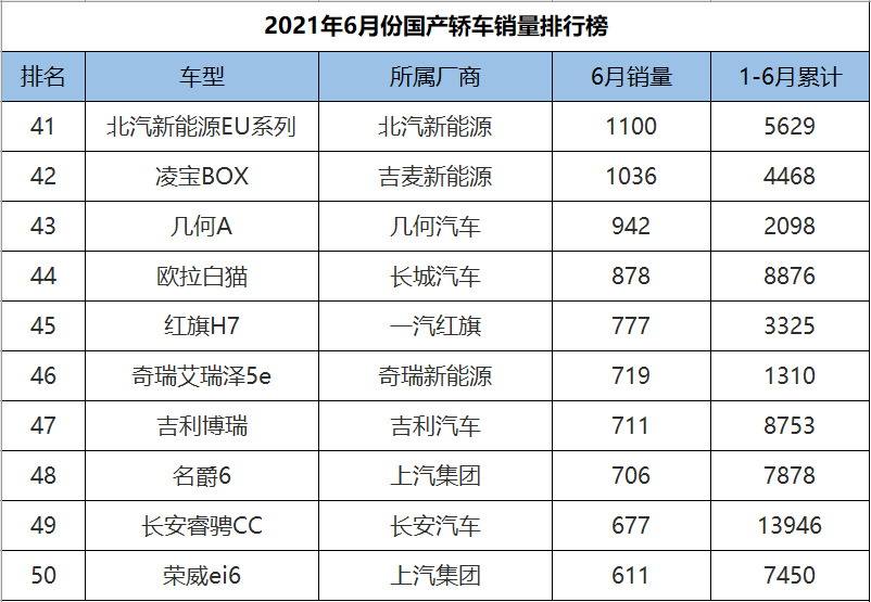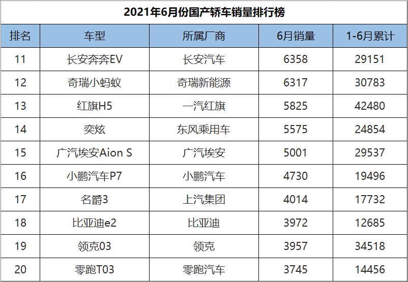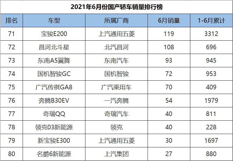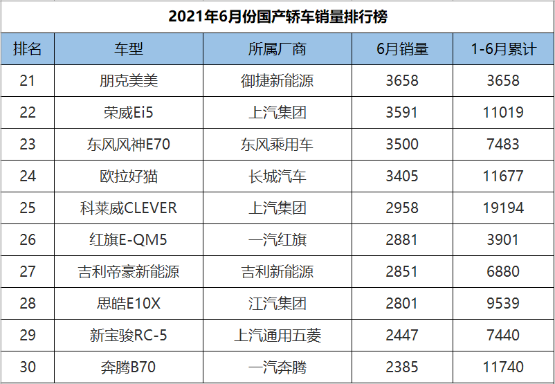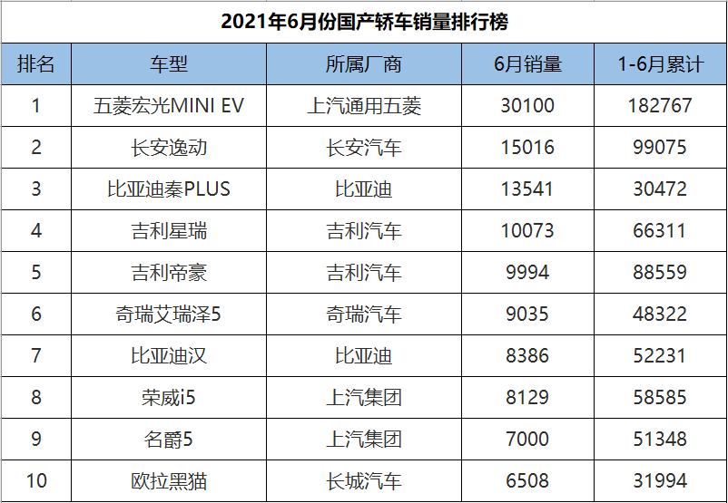 今天为大家带来2021年6月份国产轿车的销量排名情况!从数据上看,五菱宏光MINI EV以30100辆的成绩再次将冠军收入囊中,自从上市以来,五菱宏光MINI EV凭借极其亲民的售价以及时尚小巧的外形而备受年轻人宠爱,虽然在配置、续航等方面,这台车还有很多可以提升的空间,但不到三万元的起售价还可以上绿牌,确实非常适合日常通勤代步。
