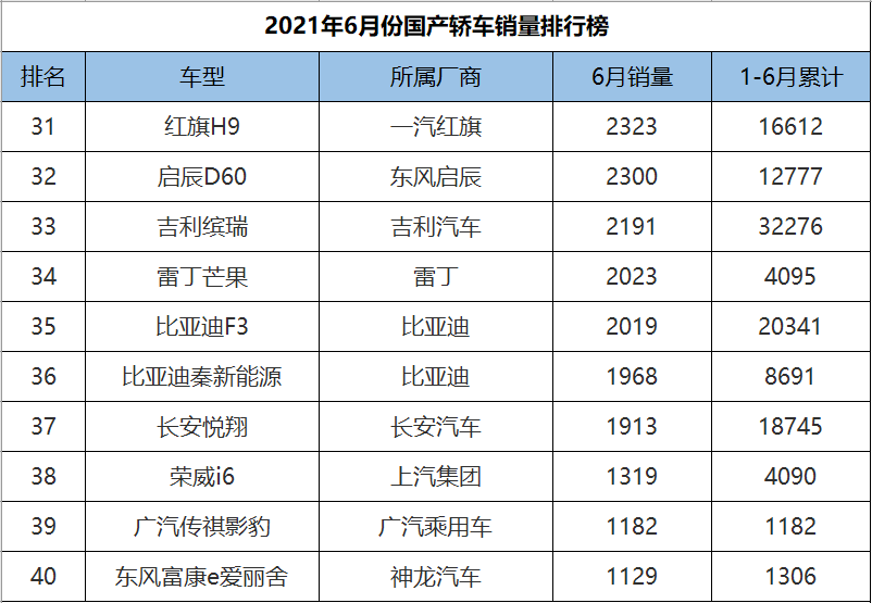 其余销量较好的车型中,奇瑞艾瑞泽5单月卖出9035辆,比亚迪汉卖出8386辆,荣威i5卖出8129辆,名爵5则有7000辆进账,此外欧拉黑猫、长安奔奔EV、奇瑞小蚂蚁这几款新能源电动车的成绩也都在六千台以上,国产高端品牌红旗旗下的两款主力车型红旗H5和红旗H9分别收获了5825和2323辆。