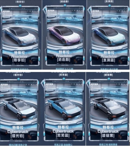在现实生活中绝对吸引眼球的两种车型,在和平精英的战场上将会被赋予不同颜色的载具皮肤。Cybertruck以镭光铂、荒芜蓝、极昼黑三种颜色呈现,而Roadster则是包含尊享铂、沁心粉、水滴蓝。