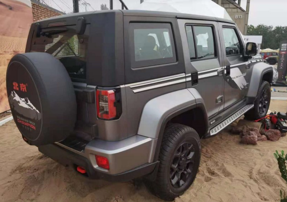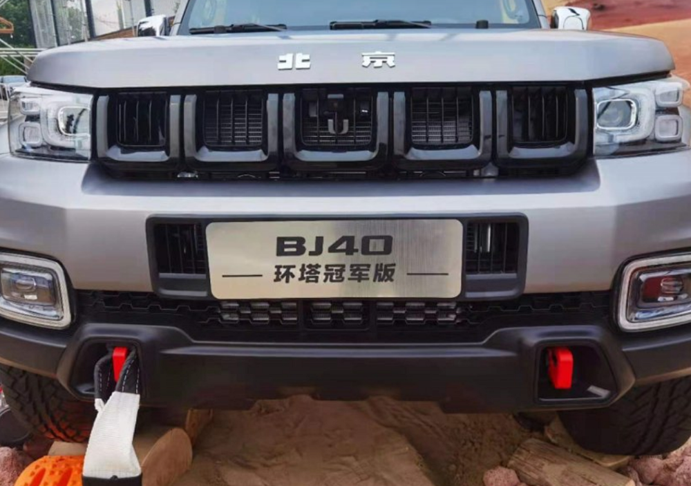 所谓的环塔冠军版车型其实就是为了纪念北京bj40赛车在环塔拉力赛上拿下的冠军成绩,所以外观设计和普通版本北京bj40是有一些差异的,首先配色就更加稀有,今年采用的是钛金灰色磨砂质感涂装,车头搭配黑色进气中网和汉字车标,保险杠位置有醒目的红色拖车钩,侧面则是原厂黑武士改装风格轮毂,而且有专属冠军版拉花。