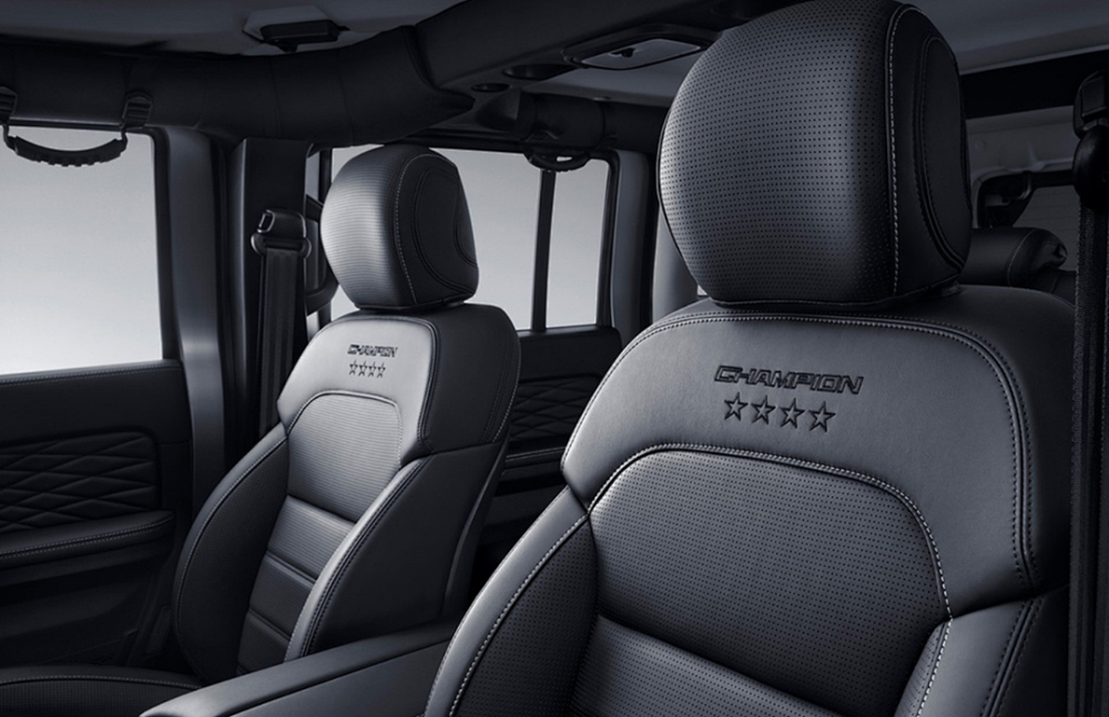 在前轮轮眉上方,可以看到非常醒目的4星徽章,而且有英文字母champion,也就是冠军的意思。车辆尾部备胎罩进行了全新设计,可以看到环塔拉力赛四星冠军徽章,这种小书包全尺寸备胎风格也带来了不错的硬派效果,虽然排气管属于隐藏设计,但是立体式熏黑尾灯已经带来了不错的硬派越野质感。