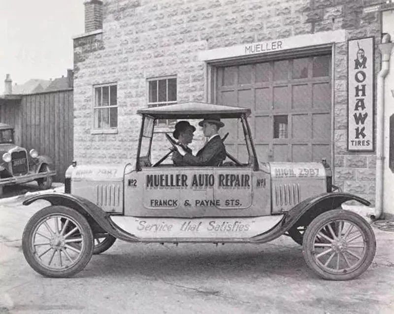 其实拥有两套操纵系统的双头汽车是存在的,比如下图这家叫Mueller Auto Repair的汽修厂,民间科学家们为了炫技把两台福特T型车的前半部分拼了起来。