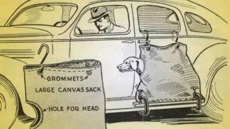 比如下图这种“狗袋”,居然是1935年时美国人想带狗狗出去兜风但又怕狗狗在车里拉撒,就这么给脑洞出来的。