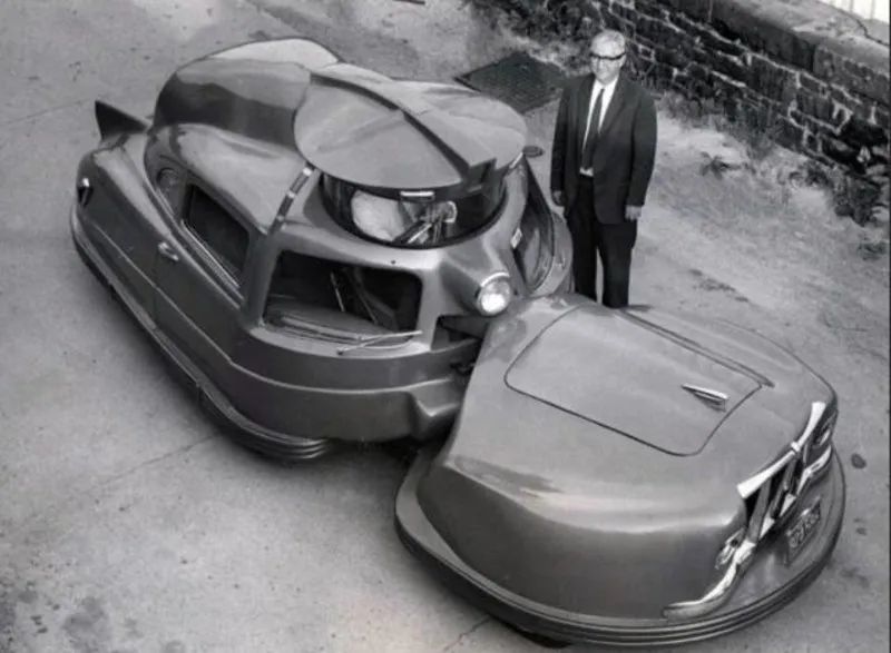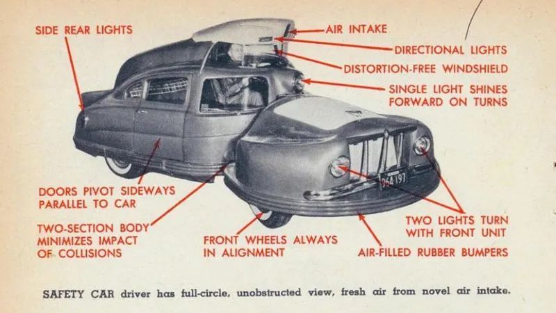 这辆叫Sir Vival的丑玩意是1958年被设计出来的,一分为二是因为想用前半截去吸收碰撞动能。