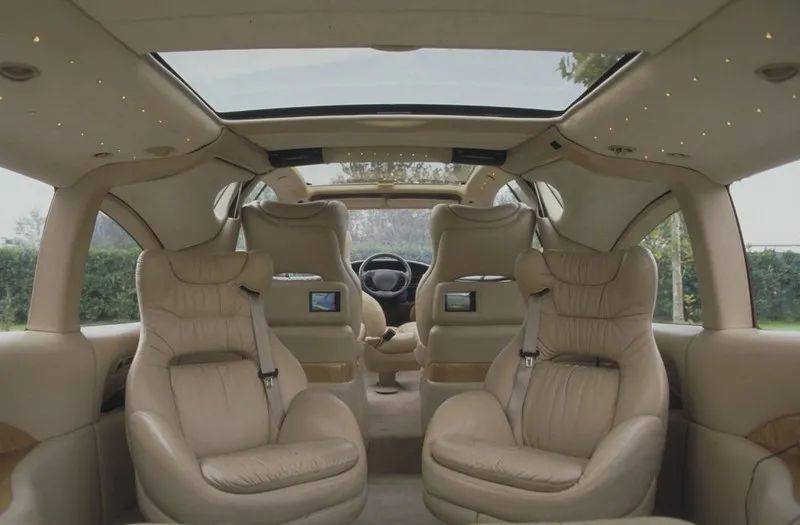 驾驶座是中置的,一共有1+2+2+2=7个全尺寸独立座椅,车长接近6米,轴距3.8米,装了一台宝马5.0L V12发动机。