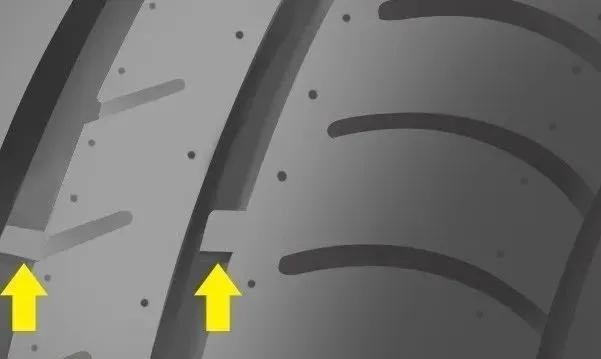 通过观察轮胎磨损标记来判断轮胎的磨损程度。磨损标记一般位于轮胎排水槽内,是一个截面为梯形的橡胶凸起物。当轮胎花纹磨至与磨损标记平齐时,必须更换轮胎。