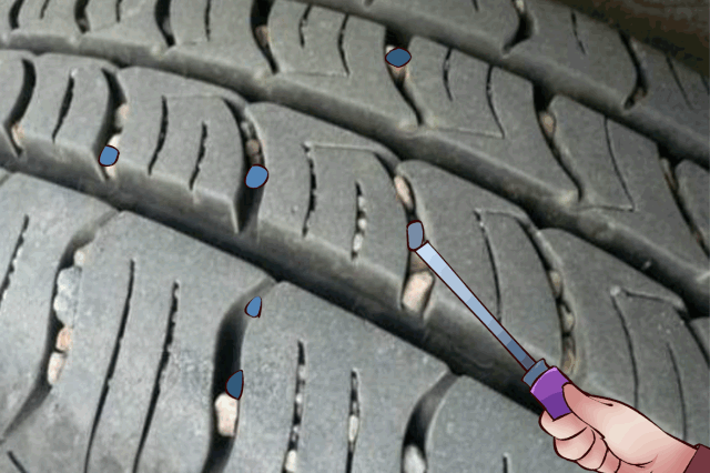 轮胎胎纹及划痕裂缝内,经常会卡入石子,不仅在行驶过程中会产生噪音,影响轮胎性能,还可能引发漏气或爆胎!