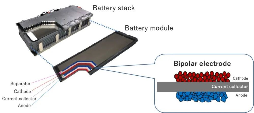 双极性镍氢电池是将集电体的一面涂为正极,另一面涂为负极的多张“双极电极(Bipolar)”堆叠在一起打包而成的电池。