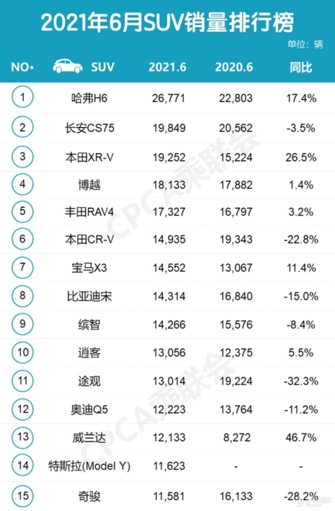 6月份的SUV市场表现较5月份略有退步,销量为71.8万辆,同比下降6.8%,环比下降2.5%;1-6月累计销量为455.1万辆,同比上涨了27.3%万辆。哈弗H6和长安CS75继续排在第一二名,本田XR-V由于优惠幅度较大,迅速爬上第三名,交出1万9252辆的成绩紧贴长安CS75的1万9849辆。