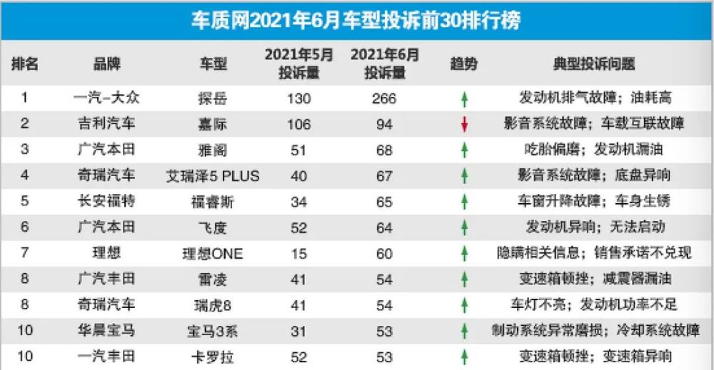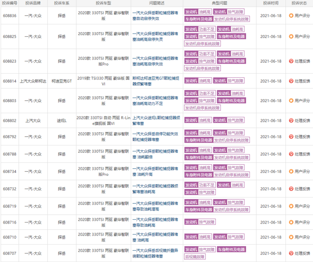 但也正是有了颗粒捕捉器的加入,很多车主发现,在用车过程中颗粒捕捉器被排气头段排出的较大颗粒物堵塞,这也直接使得大众探岳登上了投诉榜单首位(详见下表)。